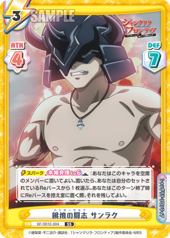 SF/001E-004 餓狼の闘志 サンラク Cost: 3 Rarity: SS Cardtype: Character Traits: (シャングリラ) / (フロンティア) ATK: 4 DEF: 7 【スパーク】【本領発揮Lv6】:あなたはこのキャラを空席のメンバーに置いてよい。置いたら、あなたは自分のセットされているReバースから1枚選ぶ。あなたはこのターン終了時にReバースを控え室に置く際、それを残してよい。 |