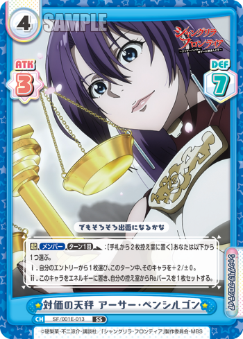 SF/001E-013 対価の天秤 アーサー・ペンシルゴン Cost: 4 Rarity: SS Cardtype: Character Traits: (シャングリラ) / (フロンティア) ATK: 3 DEF: 7 でもそろそろ出番になるかな 【起】【メンバー】【ターン1】:[手札から2枚控え室に置く]あなたは以下から1つ選ぶ。 ⅰ.自分のエントリーから1枚選び、このターン中、そのキャラを+2/±0。 ⅱ.このキャラをエネルギーに置き、自分の控え室からReバースを1枚セットする。 |