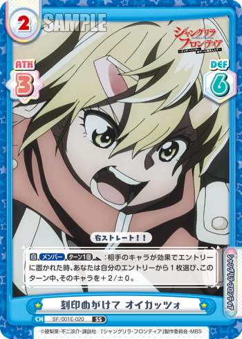 SF/001E-020 刻印めがけて オイカッツォ Cost: 2 Rarity: SS Cardtype: Character Traits: (シャングリラ) / (フロンティア) ATK: 3 DEF: 6 右ストレート!! 【自】【メンバー】【ターン1】:相手のキャラが効果でエントリーに置かれた時、あなたは自分のエントリーから1枚選び、このターン中、そのキャラを+2/±0。 |