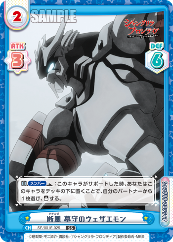 SF/001E-025 断風 墓守のウェザエモン Cost: 2 Rarity: SS Cardtype: Character Traits: (シャングリラ) / (フロンティア) ATK: 3 DEF: 6 【自】【メンバー】:このキャラがサポートした時、あなたはこのキャラをデッキの下に置くことで、自分のパートナーから1枚選び、【スタンド】する。 |