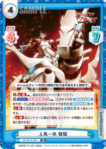 SF/001E-026 人馬一体 騏驎 Cost: 4 Rarity: SS Cardtype: Character Traits: (シャングリラ) / (フロンティア) ATK: 4 DEF: 7 ペンシルゴン「一方的に蹂躙されて成す術もなく即終了」 【永】【【魂】】:あなたのエントリーを+1/+1。 【自】【メンバー】【本領発揮Lv5】:このキャラが《ウェザエモン》をサポートした時、あなたはこのキャラをその《ウェザエモン》の【魂】にすることで、自分の控え室から《晴天》を1枚セットする。 (【魂】はエントリーに重ねて置き、エントリーが移動したら控え室に置かれる) |
