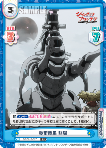 SF/001E-027 戦術機馬 騏驎 Cost: 3 Rarity: SS Cardtype: Character Traits: (シャングリラ) / (フロンティア) ATK: 3 DEF: 7 【自】【メンバー】【本領発揮Lv3】:このキャラがサポートした時、あなたはこのキャラを控え室に置くことで、1枚引く。 |
