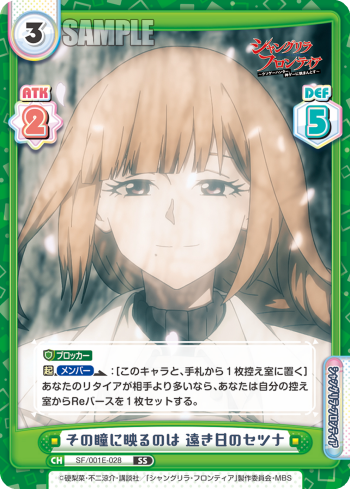 SF/001E-028 その瞳に映るのは 遠き日のセツナ Cost: 3 Rarity: SS Cardtype: Character Traits: (シャングリラ) / (フロンティア) ATK: 2 DEF: 5 【ブロッカー】 【起】【メンバー】:[このキャラと、手札から1枚控え室に置く]あなたのリタイアが相手より多いなら、あなたは自分の控え室からReバースを1枚セットする。 |