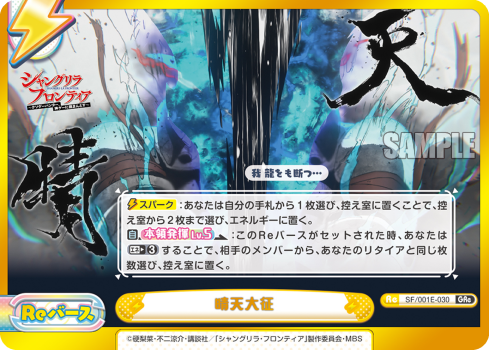 SF/001E-030 晴天大征 Cost: 0 Rarity: GRe Cardtype: Rebirth Traits: ATK: 0 DEF: 0 我 龍をも断つ… 【スパーク】:あなたは自分の手札から1枚選び、控え室に置くことで、控え室から2枚まで選び、エネルギーに置く。 【自】【本領発揮Lv5】:このReバースがセットされた時、あなたはエネ③することで、相手のメンバーから、あなたのリタイアと同じ枚数選び、控え室に置く。 |