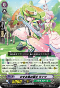 【自】:[【カウンターブラスト】(1)]このユニットが(R)からドロップゾーンに置かれた時、あなたのヴァンガードが【双闘】しているなら、コストを払ってよい。払ったら、あなたの山札の上から4枚見て、カード名に「銃士」を含むカードを1枚まで探し、(R)にコールし、その山札をシャッフルする。