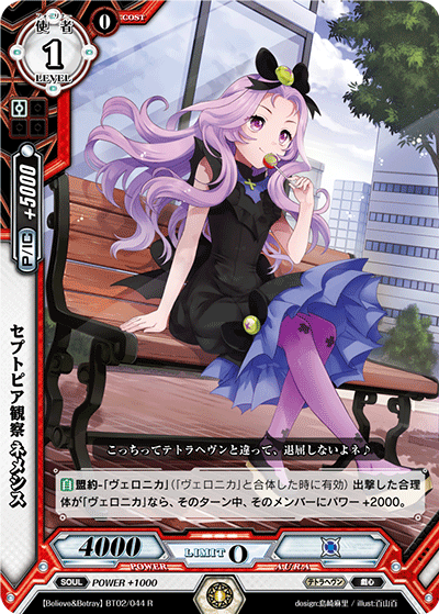 [A]:盟約-「ヴェロニカ」(「ヴェロニカ」と合体した時に有効) 出撃した合理体が「ヴェロニカ」なら、そのターン中、そのメンバーにパワー+2000。