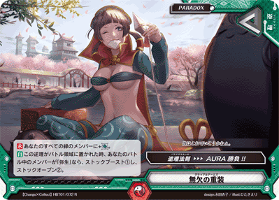 Trait 1: - (None) Trait 2: - (None) Trait 3: - (None) World: Disfia [C]: あなたのすべての緑のメンバーに+[Aura]。 [A]: この逆理がバトル領域に置かれた時、あなたのバトル中のメンバーが「弥生」なら、ストックブースト①し、ストックオープン②。 [C] All you green members gain +1 aura. [A] When this paradox is placed to the battle zone, if your member in battle is "Yayoi" Stock Boost (1), Stock Open (2). |