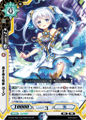 [LD] [(3)] Draw a card. Choose 1 of your "Nina" or ::Sun::, and for the turn, give that member +1 aura and "[A] When this member wins a battle, if the Paradox Rule of that battle is 'AURA BATTLE!!', choose 2 cards in your Battle Zone and return them to your hand."