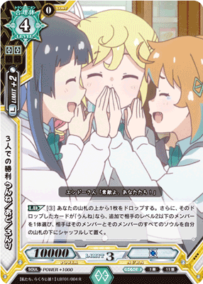 [LD] [(3)] Drop the top card of your Deck. Then, if the dropped card is an "Unne", additionally chooses 1 of your opponent's Level 2 or lower members, and your opponent shuffles that member and all that member's Soul and then put them on the bottom of his or her Deck. (That is, the chosen member and all Soul of that member are placed on the bottom of the Deck in a random order)