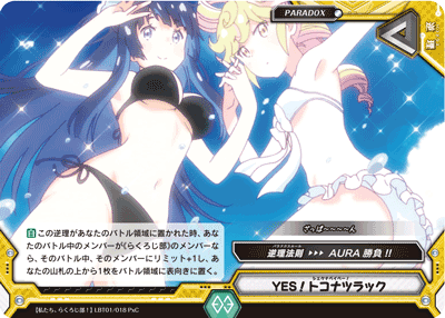 [A]: この逆理があなたのバトル領域に置かれた時、あなたのバトル中のメンバーが《らくろじ部》のメンバーなら、そのバトル中、そのメンバーにリミット+1し、あなたの山札の上から1枚をバトル領域に表向きに置く。
