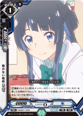 [A]:盟約-《らくろじ部》のメンバー(指定メンバーと合体した時に有効) 出撃した合理体が「ろんり」で、あなたのレベル領域にカードが4枚以上あるなら、カードを1枚引く。