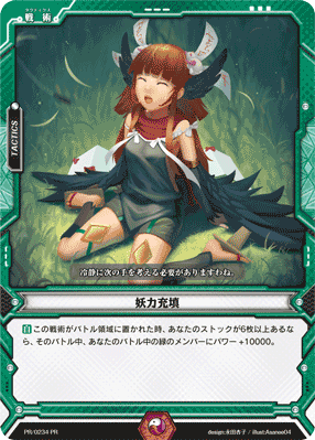 [A] When this tactics is placed to the Battle Zone, if there are 6 or more cards in your Stock, your green member in battle gains +100000 power for the battle.