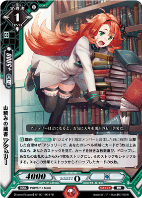 [A] Covenant - "Covenanter: Ashley" or "Jade": If the deployed Tranceunion is "Ashley" and there are 3 or more cards in your Level Zone, look at your Stock and Drop any number of them, Stock the top X+1 cards of your Deck, and shuffle your Stock. X is the number of cards Dropped from your Stock via this effect.