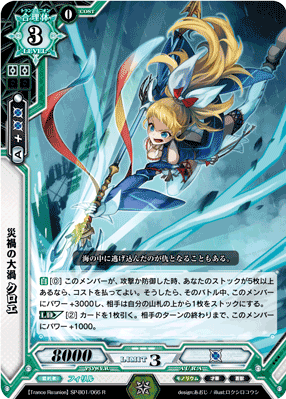 [A] [(0)] When this member attacks or defends, if there are 5 or more cards in your Stock, you may pay cost. If so, this member gains +3000 power for the battle, and your opponent Stocks the top card of his or her Deck.