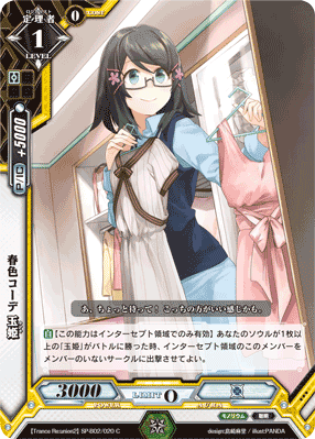 [A]:【この能力はインターセプト領域でのみ有効】 あなたのソウルが1枚以上の「玉姫」がバトルに勝った時、インターセプト領域のこのメンバーをメンバーのいないサークルに出撃させてよい。