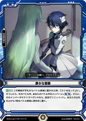 | [A] [(1)] When this tactics is placed from hand to the Battle Zone, you may pay cost. If so, for the battle, your member in battle gains +2 aura. Then, if that member is ::Tetra-Heaven::, it additionally gains +1 limit, and put the top card of your Deck face-up to the Battle Zone. |