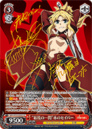 | [A] When this is placed from hand to the Stage, you may put the top card of your Clock in the Waiting Room. [A] CX COMBO [(2) Turn a face-up card in your Level Zone face-down] When this attacks, if "Clarent" is in the Climax Zone, you may pay cost. If so, deal X Damage to your Opponent, and this gains +3500 Power until the next end of your Opponent's turn. X = # of face-down cards in your Level Zone. (Damage Cancel can occur) | |