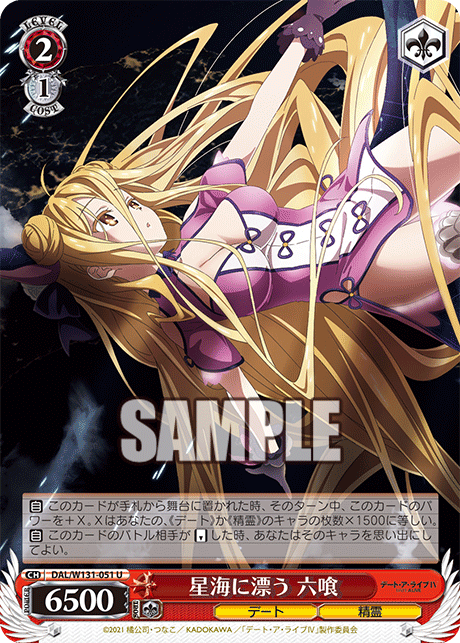 【自】 このカードが手札から舞台に置かれた時、そのターン中、このカードのパワーを+X。Xはあなたの、《デート》か《精霊》のキャラの枚数×1500に等しい。