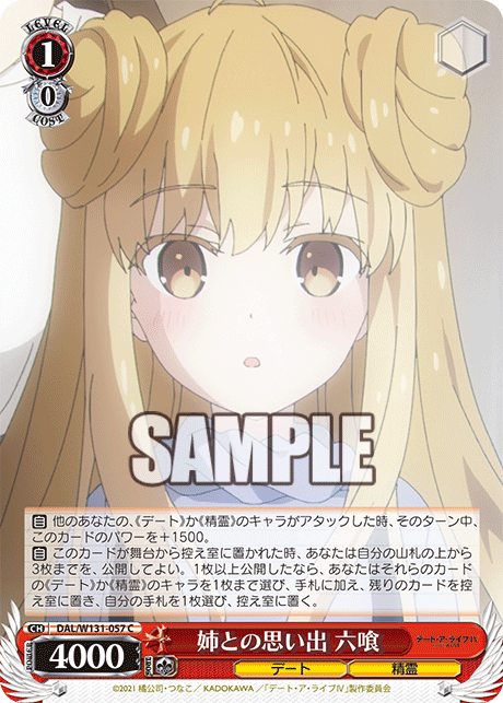 【自】 他のあなたの、《デート》か《精霊》のキャラがアタックした時、そのターン中、このカードのパワーを+1500。
