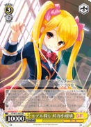 | [A] This ability activates up to once per turn. During the turn this is placed from hand to the Stage, when the Damage dealt by this is Cancelled, put the top card of your Library in the Waiting Room, and deal X Damage to your Opponent. X = 1 + Level of that card. (Climax cards are considered Level 0 for this effect. Damage Cancel can occur) [A] When the Battle Opponent of this becomes Reversed, you may Send that Character to Memory. | |