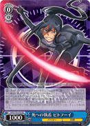 Trait 1: アバター (Avatar) Trait 2: 武器 (Weapon) 【自】[あなたのストックの上から1枚をクロック置場に置く] このカードが手札から舞台に置かれた時、あなたはコストを払ってよい。そうしたら、あなたは自分の山札を見て自分のレベル以下でコスト0以下の、《アバター》か《ネット》のキャラを1枚まで選び、舞台の好きな枠に置き、その山札をシャッフルする。 【自】[(1)] このカードがアタックした時、あなたはコストを払ってよい。そうしたら、そのアタック中、あなたはトリガーステップにトリガーチェックを2回行う。 |