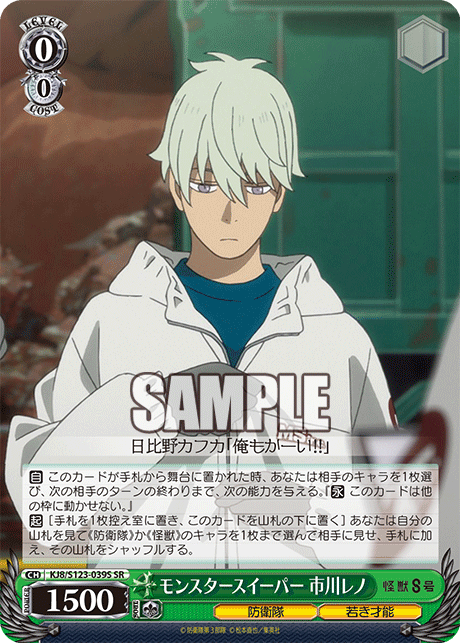 Traits: 防衛隊 (Defense Force), 若き才能 (Young Talent) 【自】 このカードが手札から舞台に置かれた時、あなたは相手のキャラを1枚選び、次の相手のターンの終わりまで、次の能力を与える。『【永】 このカードは他の枠に動かせない。』 【起】[手札を1枚控え室に置き、このカードを山札の下に置く] あなたは自分の山札を見て《防衛隊》か《怪獣》のキャラを1枚まで選んで相手に見せ、手札に加え、その山札をシャッフルする。 |
