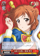 Traits: レヴュー (Revue), 武器 (Weapon) 【永】 他のあなたの《レヴュー》のキャラが2枚以上なら、このカードのパワーを+1000。 【自】 アンコール [あなたの山札の上から1枚をクロック置場に置く] (このカードが舞台から控え室に置かれた時、あなたはコストを払ってよい。そうしたら、このカードがいた枠に【レスト】して置く) |