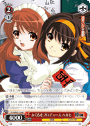 Traits: 団長 (Brigade Chief), SOS団 (SOS Brigade) 【永】 応援 このカードの前のあなたのレベル3以上のキャラすべてに、パワーを+2000。 【自】[手札を1枚控え室に置く] このカードが手札から舞台に置かれた時、あなたはコストを払ってよい。そうしたら、あなたは自分の控え室の、《団長》か《SOS団》のキャラを1枚選び、手札に戻す。 |