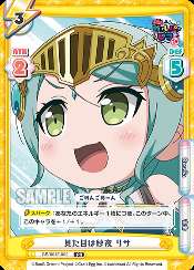 GP/001E-002 見た目は紗夜 リサ Lisa, Looks Like Sayo Cost: 3 Rarity: PR Cardtype: Character Traits: Music (音楽) / Roselia (Roselia) ATK: 2 DEF: 5 [Spark]: For the turn this gains +1/+1 for each of your Energy. ごめんごめーん 【スパーク】:あなたのエネルギー1枚につき、このターン中、このキャラを+1/+1。 |