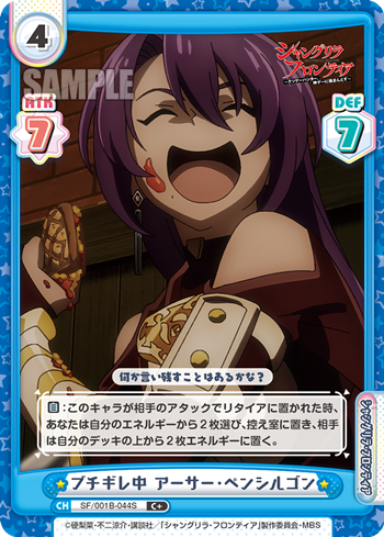 【自】:このキャラが相手のアタックでリタイアに置かれた時、あなたは自分のエネルギーから2枚選び、控え室に置き、相手は自分のデッキの上から2枚エネルギーに置く。