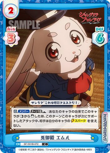 【自】【メンバー】【ターン1】:あなたのキャラの効果でこのキャラが【レスト】から【スタンド】した時、このターンこのキャラが次にサポートしたアタック中、相手は自分のキャラの【スパーク】を使えない。