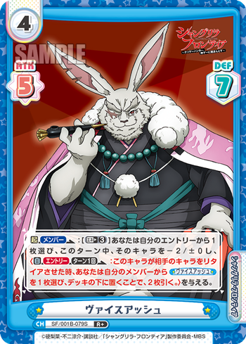 【起】【メンバー】:[エネ③]あなたは自分のエントリーから1枚選び、このターン中、そのキャラを-2/±0し、〈【自】【エントリー】【ターン1】:このキャラが相手のキャラをリタイアさせた時、あなたは自分のメンバーから《ヴァイスアッシュ》を1枚選び、デッキの下に置くことで、2枚引く。〉を与える。