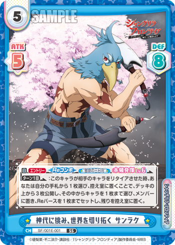 SF/001E-001 神代に挑み、世界を切り拓く サンラク Cost: 5 Rarity: SS Cardtype: Character Traits: (シャングリラ) / (フロンティア) ATK: 5 DEF: 8 【自】【エントリー】【Reコンボ】《%%%致命の三日月%%%》【本領発揮Lv6】【ターン1】:このキャラが相手のキャラをリタイアさせた時、あなたは自分の手札から1枚選び、控え室に置くことで、デッキの上から3枚公開し、その中からキャラを1枚まで選び、メンバーに置き、Reバースを1枚までセットし、残りを控え室に置く。 |