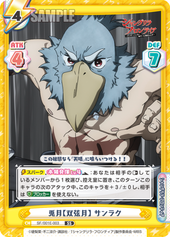 SF/001E-003 兎月【双弦月】 サンラク Cost: 4 Rarity: SS Cardtype: Character Traits: (シャングリラ) / (フロンティア) ATK: 4 DEF: 7 この状態なら「天晴」に喰らいつける!! 【スパーク】【本領発揮Lv4】:あなたは相手の【レスト】しているメンバーから1枚選び、控え室に置き、このターンこのキャラの次のアタック中、このキャラを+3/±0し、相手は【ブロッカー】を使えない。 |