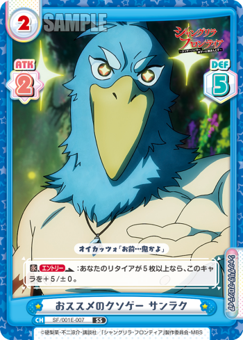 SF/001E-007 おススメのクソゲー サンラク Cost: 2 Rarity: SS Cardtype: Character Traits: (シャングリラ) / (フロンティア) ATK: 2 DEF: 5 オイカッツォ「お前…鬼かよ」 【永】【エントリー】:あなたのリタイアが5枚以上なら、このキャラを+5/±0。 |
