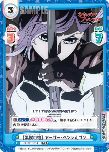 SF/001E-014 【黒楔の槍】 アーサー・ペンシルゴン Cost: 3 Rarity: SS Cardtype: Character Traits: (シャングリラ) / (フロンティア) ATK: 3 DEF: 7 しかして相容れぬ万有の黒を穿つ 【永】【メンバー】【本領発揮Lv5】:相手は自分のエントリーの【起】を使えない。 |