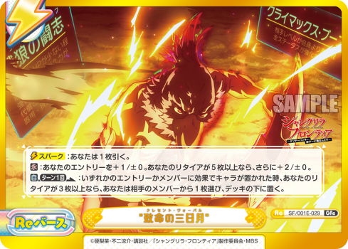 SF/001E-029 %%%致命の三日月%%% Cost: 0 Rarity: GRe Cardtype: Rebirth Traits: ATK: 0 DEF: 0 【スパーク】:あなたは1枚引く。 【永】:あなたのエントリーを+1/±0。あなたのリタイアが5枚以上なら、さらに+2/±0。 【自】【ターン1】:いずれかのエントリーかメンバーに効果でキャラが置かれた時、あなたのリタイアが3枚以上なら、あなたは相手のメンバーから1枚選び、デッキの下に置く。 |